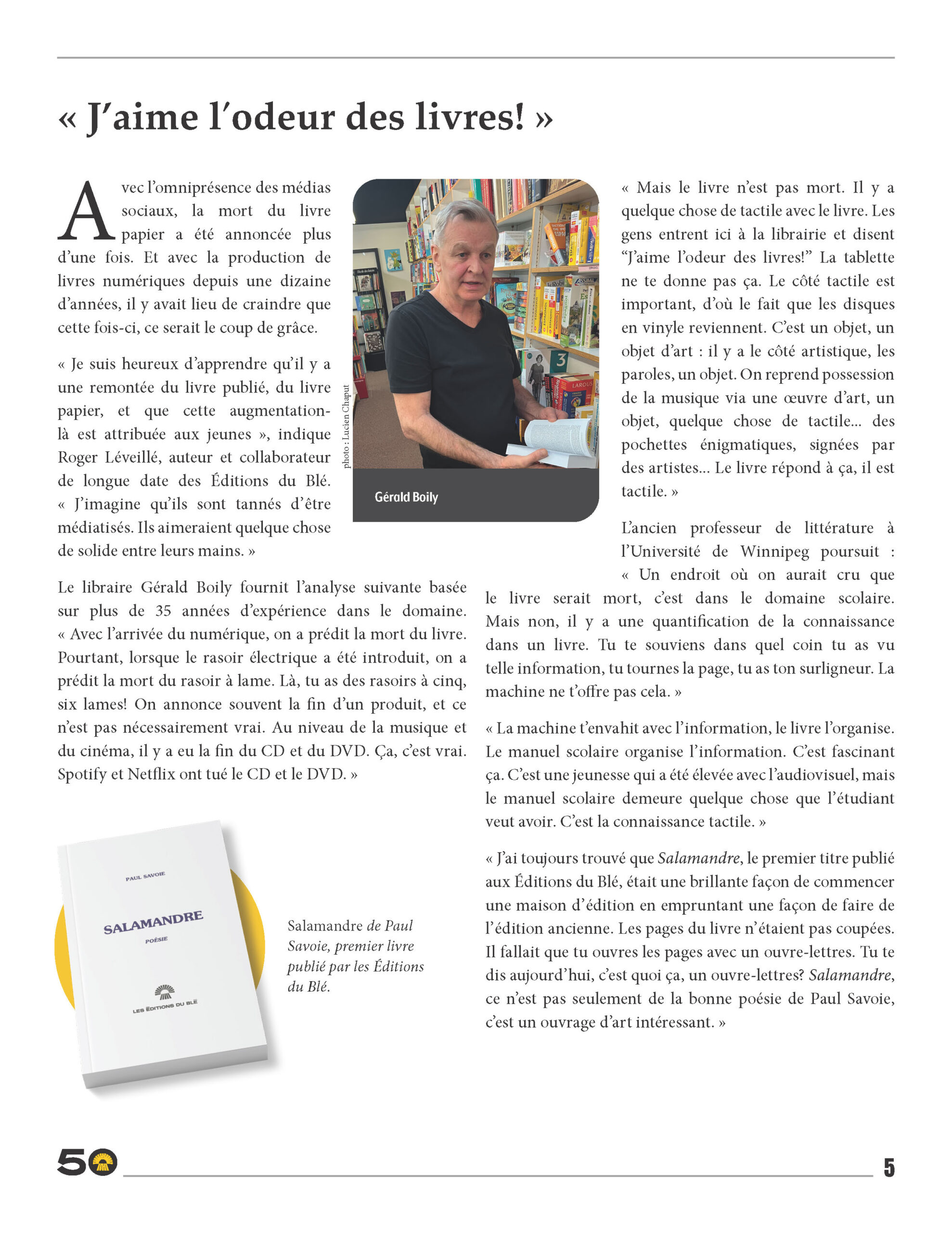 «Je suis heureux d’apprendre qu’il y a une remontée du livre publié, du livre papier, et que cette augmentation-là est attribuée aux jeunes», indique Roger Léveillé, auteur et collaborateur de longue date des Éditions du Blé. «J’imagine qu’ils sont tannés d’être médiatisés. Ils aimeraient quelque chose de solide entre leurs mains.»