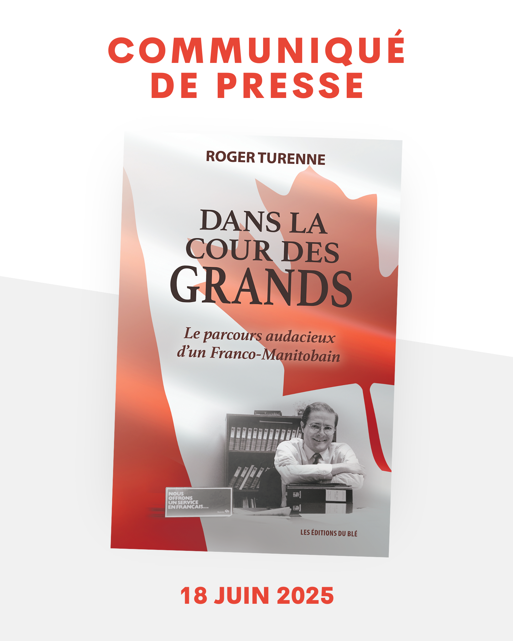 Les Éditions du Blé vous invitent avec joie au lancement de sa quatrième publication de l’année, les mémoires de Roger Turenne intitulés Dans la cour des grands : le parcours audacieux d’un franco-manitobain. Cet évènement aura lieu le mercredi 25 juin à 19 h dans le Salon Empire du Centre du Patrimoine (situé au Centre culturel franco-manitobain), au 340, boulevard Provencher, à Saint-Boniface. Le lancement sera animé par le journaliste de Radio-Canada, Jérémy Laniel. Un rendez-vous à ne pas manquer : des histoires fascinantes, des anecdotes inédites, et l’occasion de lever le voile sur l’univers diplomatique et politique canadien ! Le livre sera disponible en librairie le même jour.